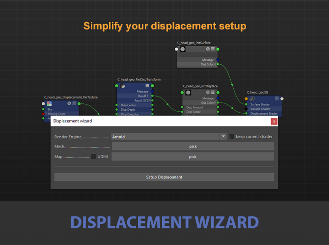 Automated displacement setup tool for Arnold, renderman and vray